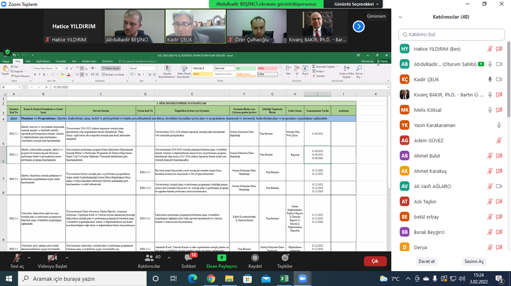 Strateji Geliştirme Daire Başkanlığı, Daire Başkanı Kadir ÇELİK’ in başkanlığında 2022-2024 Yılı İç Kontrol ve Standartları Uyum Eylem Planı hazırlık çalışmaları kapsamında Eylem Planı Hazırlama ve Çalışma Gruba ile üniversitemizin tüm birimlerini kapsayacak şekilde akademik ve idari personellerin katılımıyla 03/02/2022 Perşembe günü saat 15.00’da gündem maddelerini görüşmek üzere video konferans yöntemiyle toplanarak sunulan taslak eylem planının, birimler tarafından öngörülen görüş ve önerilerin 11.02.2022 tarih mesai bitimine kadar strateji@bartin.edu.tr adresine mail ile gönderilmesine karar verilmiştir.