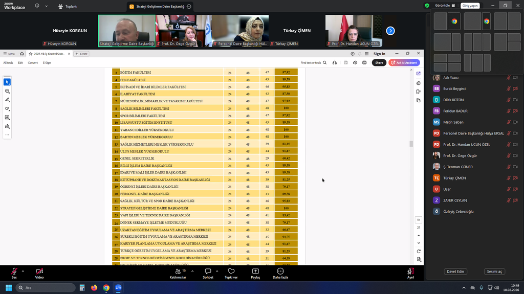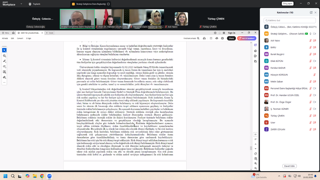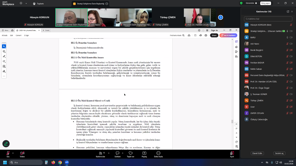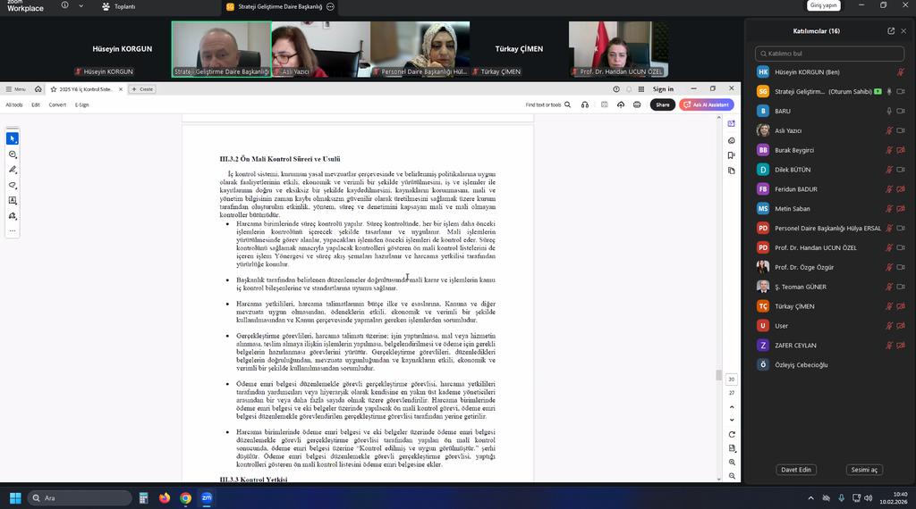 Strateji Geliştirme Daire Başkanlığımız tarafından hazırlanan İç Kontrol İzleme ve Yönlendirme Kurulu toplantısı gerçekleştirildi. Yapılan toplantıda, 2025 Yılı İç Kontrol Sistemi Değerlendirme Raporu taslağı kurul üyelerine sunuldu. Sunulan taslak, kurul üyeleri tarafından görüş ve öneriler doğrultusunda değerlendirilerek nihai hâlinin verilmesi kararlaştırıldı.