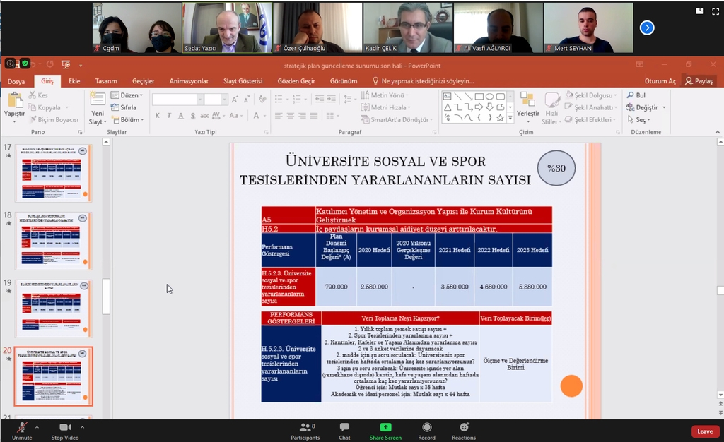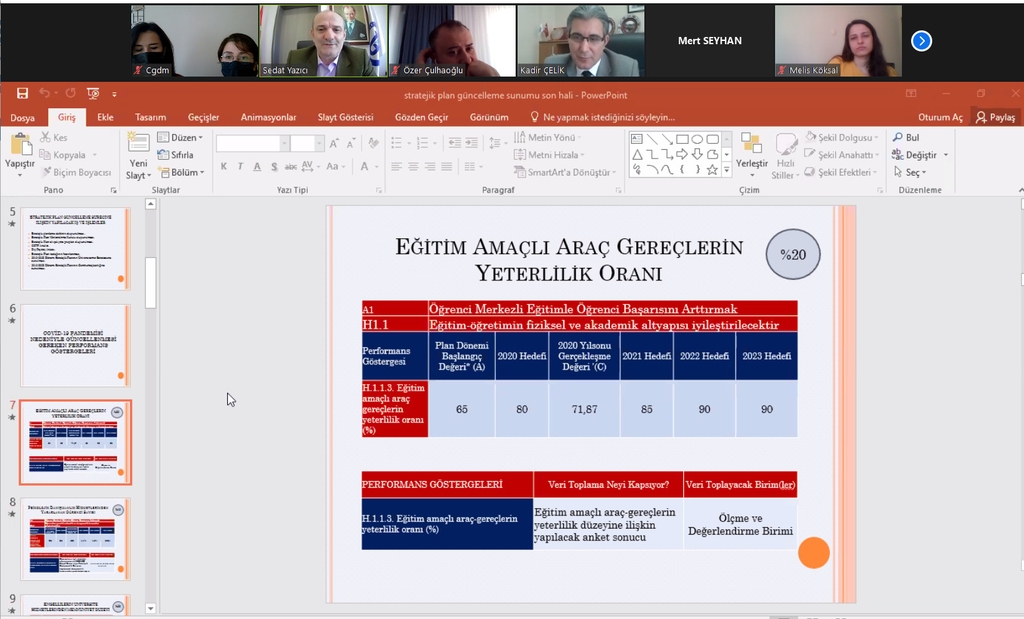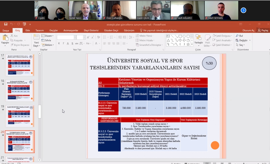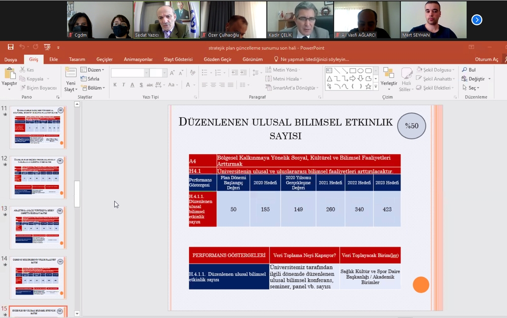Üniversitemiz 2019-2023 Stratejik Planının güncellenmesi çalışmaları kapsamında 21.04.2021 tarihinde Rektör Yardımcısı Prof. Dr. Sedat YAZICI'nın başkanlığında Strateji Geliştirme Daire Başkanlığı Stratejik Plan Ekibi ve Kalite Koordinatörlüğünün katılımıyla güncelleme çalışmalarının planlanması ve değerlendirilmesi amacıyla çevrimiçi toplantı gerçekleştirilmiştir.
